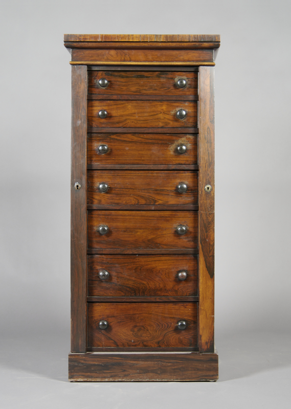 the rectangular top over seven drawers with dual side locking columns, raised on a plinth base.