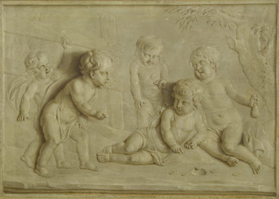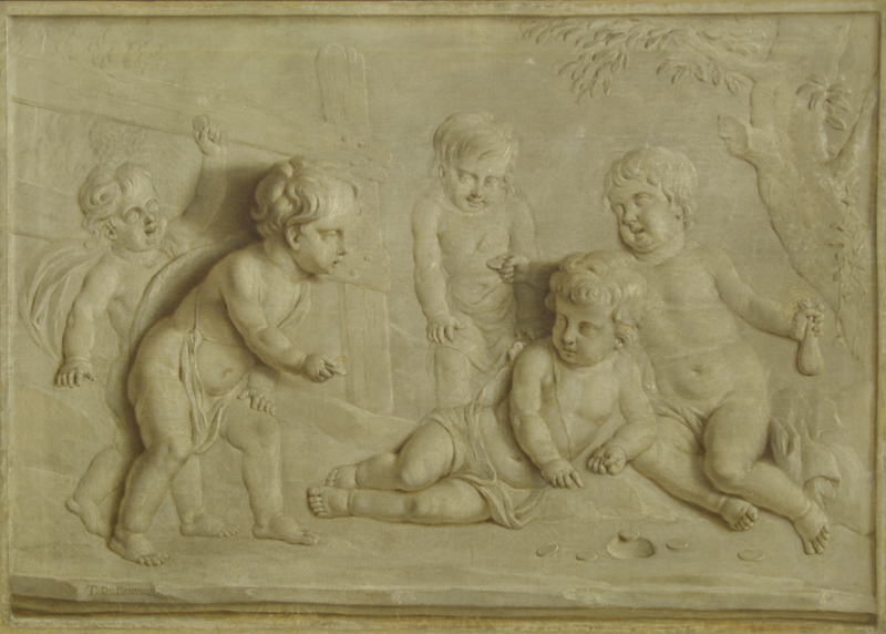 oil on canvas en grisaille, the figures depicted in an outdoor setting playing a game with flattened pebbles, signed at lower left.