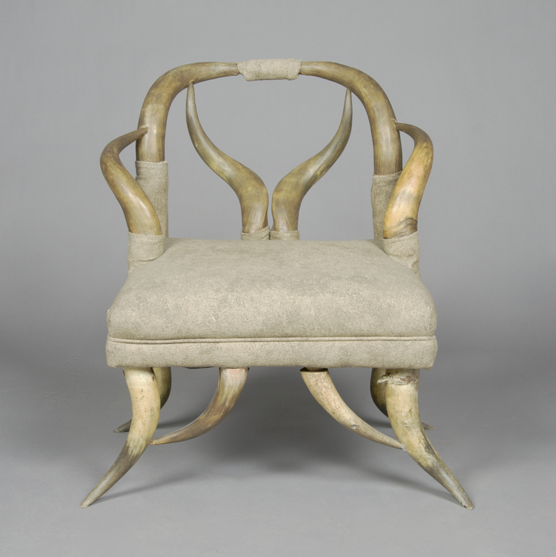 the back comprised of six scrolling steer horns over the square upholstered seat, raised on an additional four splayed horns.