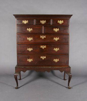 of rectangular form, having three short drawers above two medium drawers over three long, graduated drawers, raised on cabriole legs.
