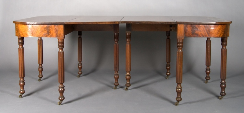 in two sections, each with demilune top and rectangular leaf over a plain frieze, raised on reeded legs ending in casters.