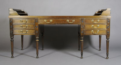 the rectangular top flanked by two letter racks over a series of drawers, raised on tapering fluted legs.