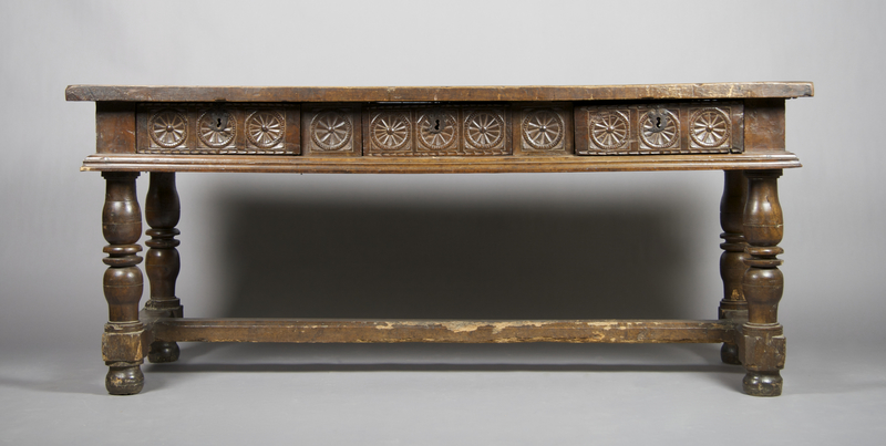 rectangular top over a carved frieze set with three drawers raised on turned legs joined by stretchers.