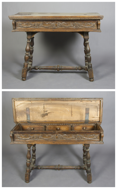 the rectangular split top opening to a fitted interior over a relief carved frieze, raised on turned legs and stretchers.