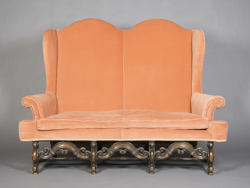 of high wingback form, having upholstered back, arms and seat,raised on carved legs joined by stretchers.