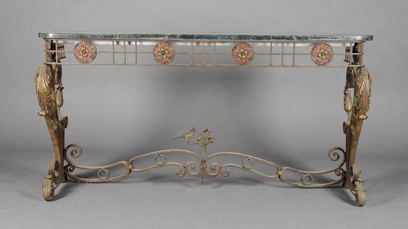 having scrolling and polychrome decorated foliage throughout containing a three part horizontal mirror with armorial crest above a stone top supported by a metal base of scrolling wrought iron with a floral motif.