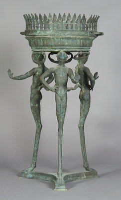 the circular galleried basin raised on three male monopodiae on atripartite base.