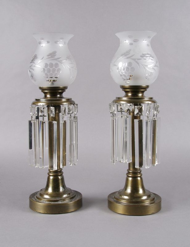 having frosted and cut glass shades over a baluster form standard, hung with prisms.