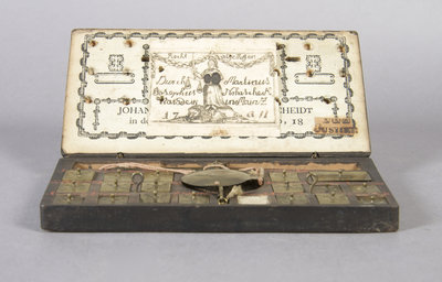 circa 1780, in a fitted case with decorated paper interior having maker's name, 18 brass weights and folding shaft with round brass plates.