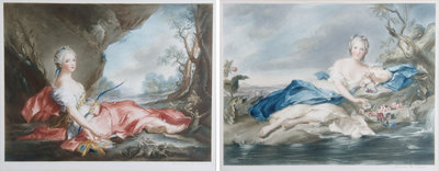 19th century, depicting reclining ladies, in painted and parcel gilt frames.