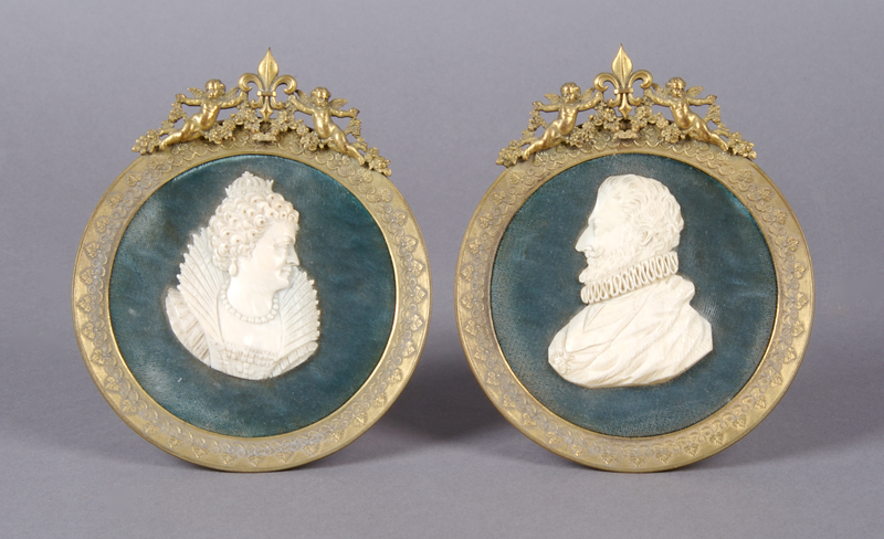 one depicting Henry IV, the other Mary de Medici, each set on a velvet background within gilt metal frames.