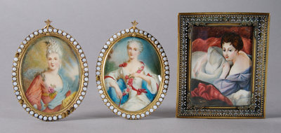 each oval depicting a lady and with jeweled frames, together with another miniature of a lady.