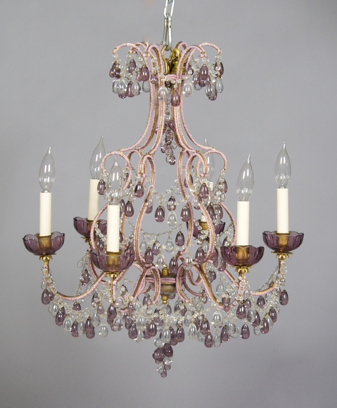 of cage form, the standard issuing six scrolling arms ending in candle cups, the whole hung with prisms and swags and having purple beaded decoration.