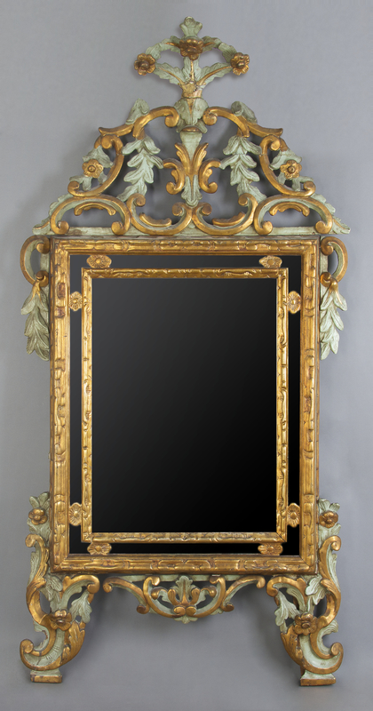 having a rectangular plate under a scrolling crest, the frame inset with mirrored panels.