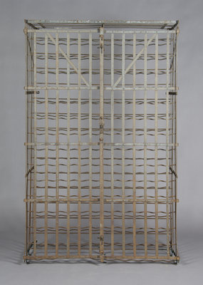 the cage form construction of metal slats with fitted interior for bottles, having lockplate bearing the name of Fen Rigide.