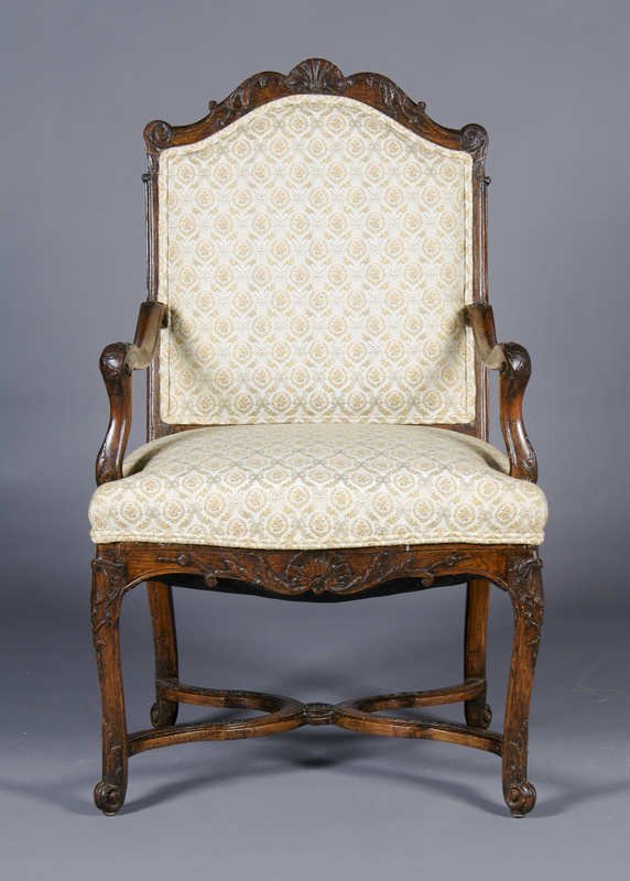 the shell carved crest over an upholstered back and seat, raised on carved cabriole legs joined by stretchers.