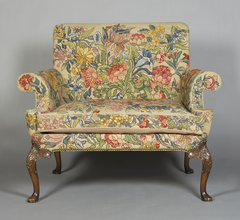 having a needlepoint upholstered back, arms and seat, raised on carved cabriole legs.