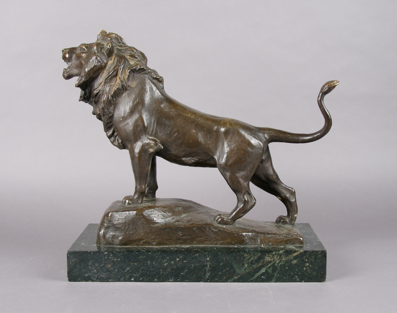 depicting a striding lion upon a green marble base, impressed H. Muller.