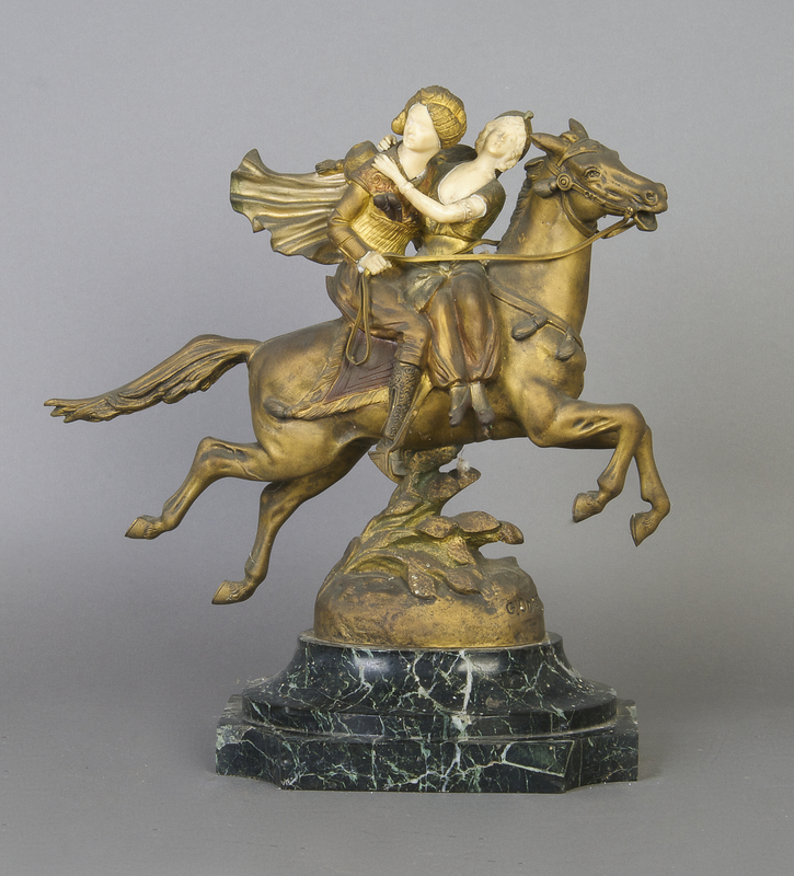 depicting a figure wearing a turban with a woman on horseback, impressed on bronze G. Omerth, raised atop a marble base.