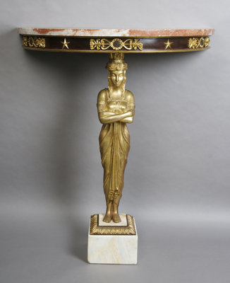 supported by a giltwood term in the form of a classical woman on a stone base.