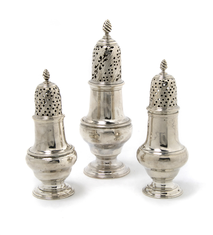 circa 1760, James Darquits, Jr., all having twisted finials and chased decoration to tops; approximate weight 9.85 ozt.