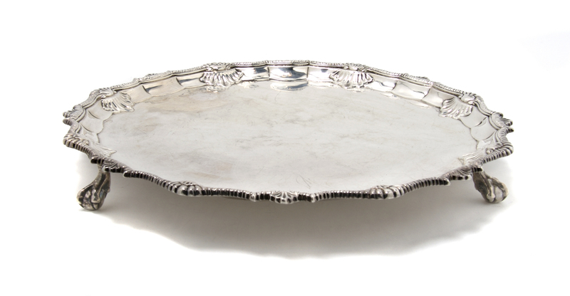 1765-1766, Ebenezer Coker, with piecrust, gadroon and shell rim, raised on three claw and ball feet; approximate weight 26.415 ozt.