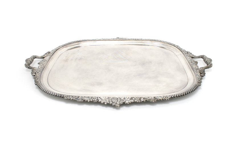 of rectangular form with rounded corners, the edges and handles having raised floral decoration, unmarked.