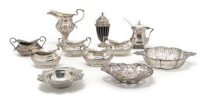 comprising two with cobalt glass liners, a dish, a creamer, five salts and two nut dishes; 11 items total.