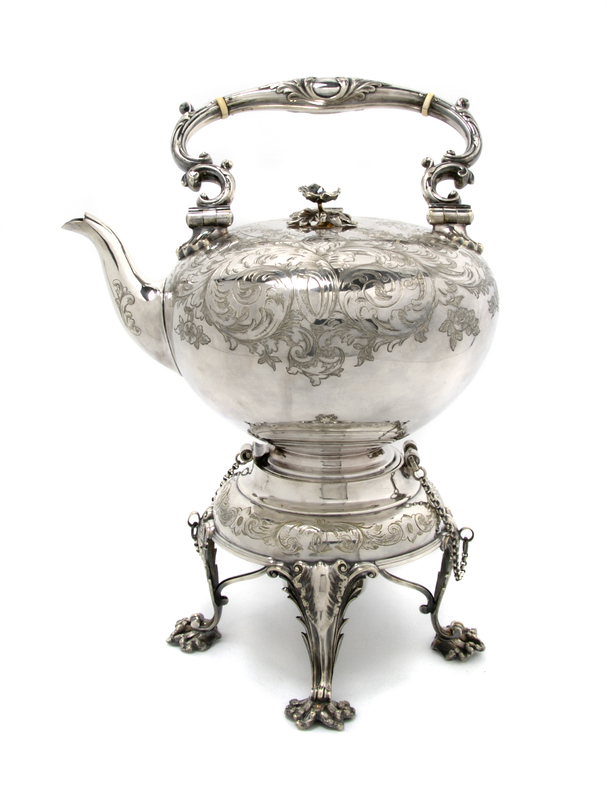 mid-19th century, Elkington, Mason & Co., having hinged lid and handle, floral finial, and chased floral decoration throughout.