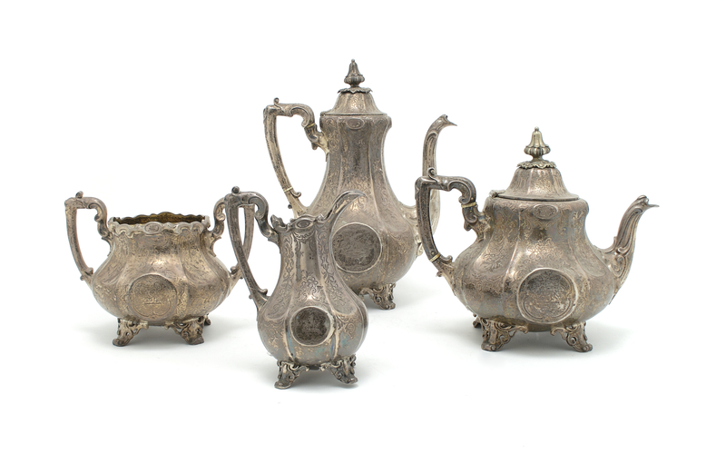 1849-50, Charles Reily and George Storer, comprising a coffee pot, teapot, creamer and sugar, all crested and having etched floral decoration throughout; approximate weight 72.91 ozt.