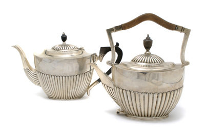 both having hinged lids with finials, wooden handles and lobed bodies, the first by London makers William Gibson and John Langman, 1898-99, further marked to base 'The Goldsmiths & Silversmiths Co. Ltd. 112 Regent St. London'; the other by Birmingham maker Barker Bros., 1903-04; approximate weight 40.97 ozt.