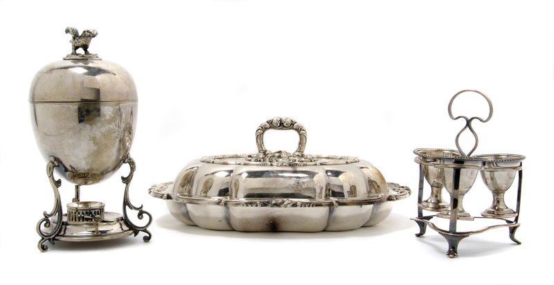 comprising a Sheffield egg warmer with bird finial, a set of three egg cups with stand and a warming dish.