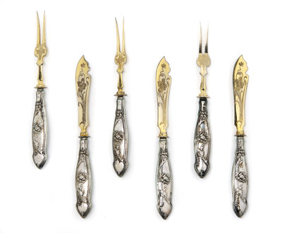 having gilded tines and blades with chased decoration, the silver handles having raised floral decoration; 24 items total in a fitted case.