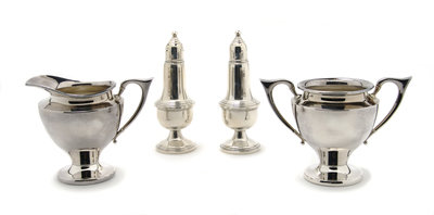 weighted, with glass liners; together with an English silverplate creamer and sugar, Royal Rochester.
