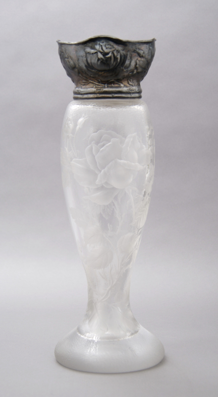 of baluster form, the glass body, cut and engraved with sprays of roses, the undulating silver collar chased with roses and thorns, marked on collar with pattern number D1726.