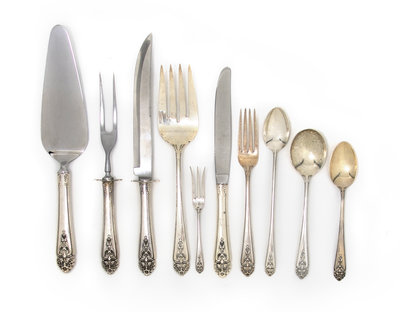 in the Queen's Lace pattern, comprising 8 dinner knives, 7 dinner forks, 8 salad forks, 16 teaspoons, 8 soup spoons, 8 butter knives, 8 cocktail forks, 8 stirring spoons, 4 serving spoons, 3 pierced serving spoons, a serving knife, 2 ladles, a cheese fork, a cake server, an olive fork, a carving set and another spoon and fork; approximate weight 90.15 ozt.