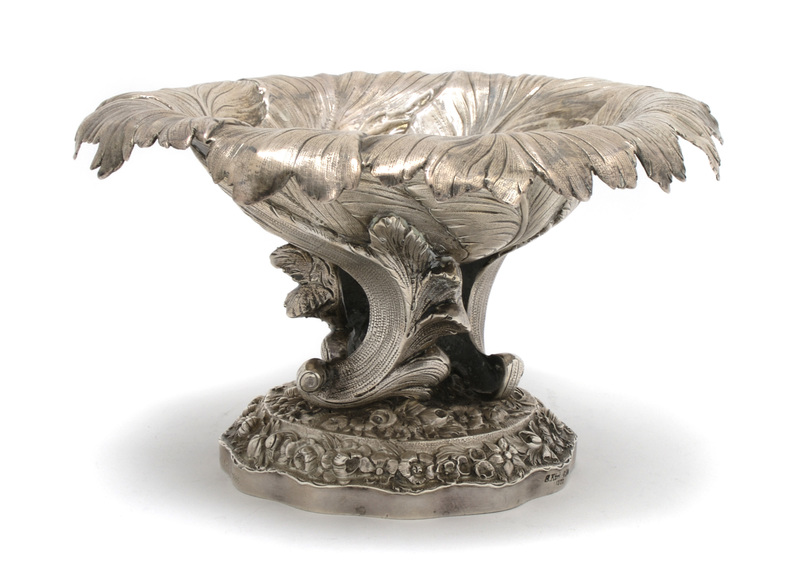 of leaf form, with etched dedication reading 'Mr. Gill to Mr. Garret Pigeon Shooting Oct. 30-1886,' marked S. Kirk & Sons, 11OZ.