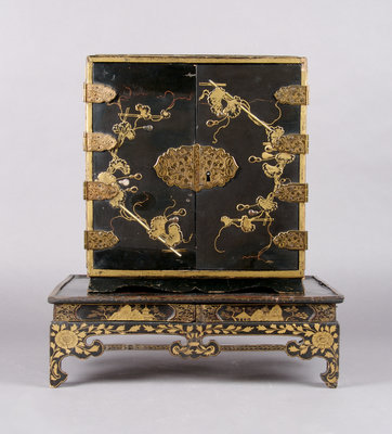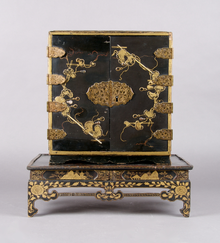 A Chinese Black Lacquered Diminutive Cabinet on Stand,