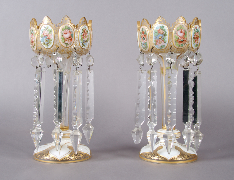 each of baluster form, with polychrome floral and gilt decoration, hung with prisms.