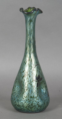 of pinched bottle form with ruffled rim, the glass with oil spot decoration, the overlay in the form of stylized flowers and stems.