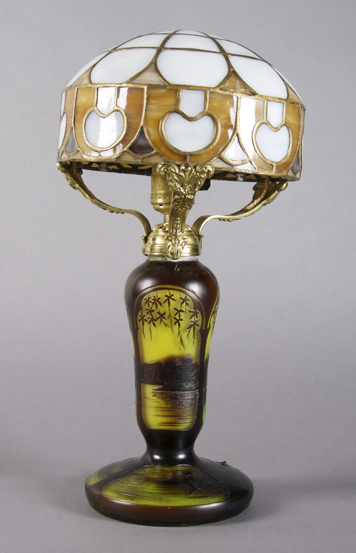 decorated with landscapes, together with an associated leaded glassshade.