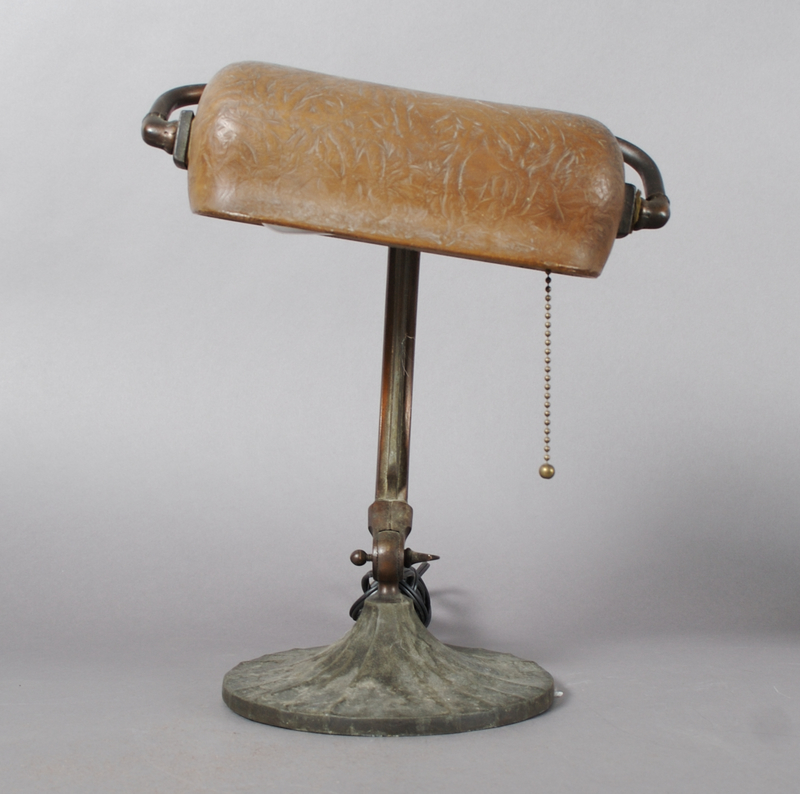having a tubular shade on an adjustable bronze base, the shade signed Brown Handel, 6010 1/2, base with felt Handel label.