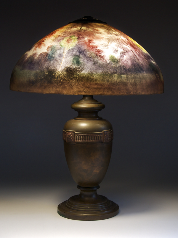 the domed shade decorated with a landscape, signed Handel 6947, John Bailey, raised on an urn form base with stepped foot.