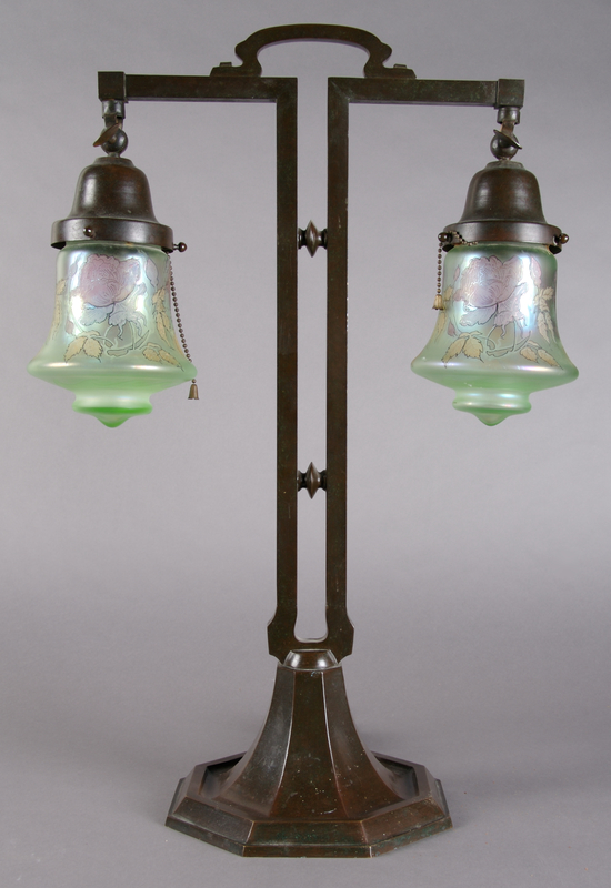 the Arts and Crafts style frame with two unsigned reverse painted shades over an octagonal base.