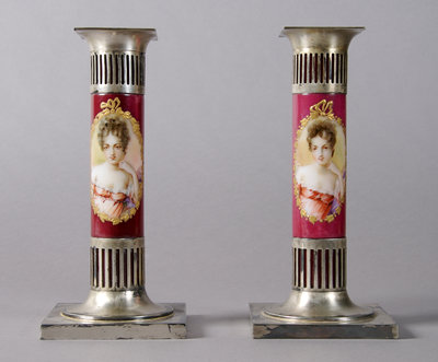 A Pair of Pairpoint Ceramic and Silvered Metal Candlesticks,
