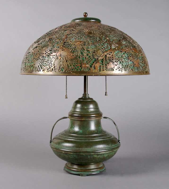 the filigree shade with spurious Tiffany Studios tag, the urn form basealso with spurious markings.