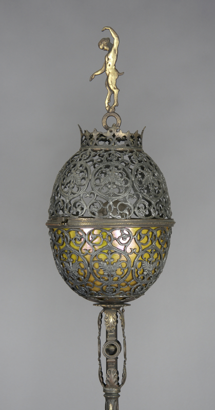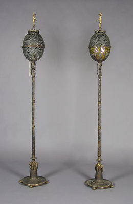 having a satyr form finial above ovoid form metal cages with foliate decoration, having the lower half of one aurene Steuben shade in one torchere, the stem having foliate pattern with bird head motif above a circular base, having metal plaque with signature on underside.