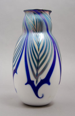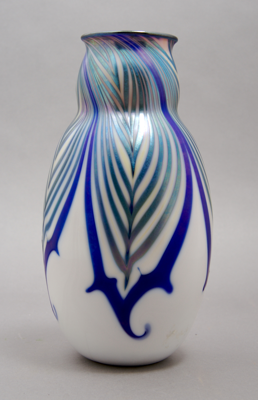 of double gourd form, having pulled iridescent decoration on a white ground, signed and dated 1975.