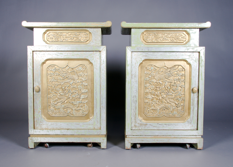 each in the Chinese style having a drawer over a door, both with relief carved panels.