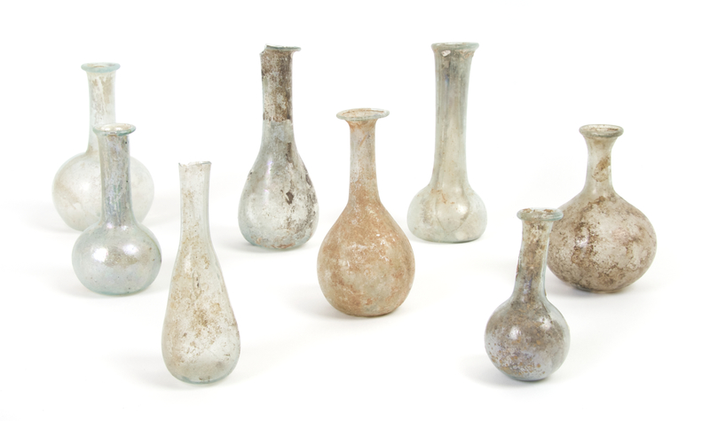 A Collection of Eight Roman Glass Flasks and Unguentariums,